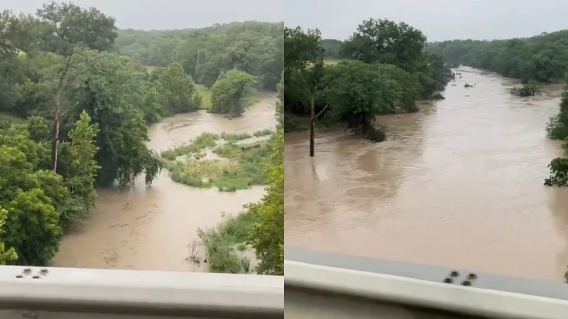 The Guadalupe River, already spilling over its banks on July 4, 2025, (left), rose to a record breaking 47.4 feet on July 5 (right). / Credit: Sophie Abuzeid