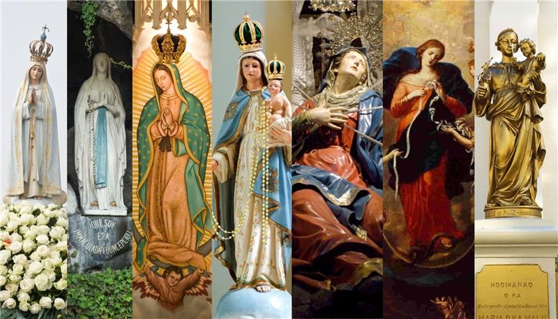 From left: Our Lady of Fatima; Our Lady of Lourdes; Our Lady of Guadalupe; Our Lady of the Rosary; Our Lady of Sorrows; Our Lady, Undoer of Knots; and Our Lady of Peace. / Credit: Ricardoperna via Canva Teams; rparys via Canva Teams; Bluebird13 via Canva Teams; Sidney de Almeida via Canva Teams; Zarateman, CC BY-SA 4.0, via Wikimedia Commons; Johann Georg Melchior Schmidtner (1625-1705), Public domain, via Wikimedia Commons; and Gerald Farinas at English Wikipedia, CC BY-SA 3.0, via Wikimedia Commons