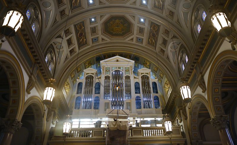 The new gallery organ sits under the Cathedral of the Sacred Heart’s coffered ceiling. Credit: Alexa Edlund