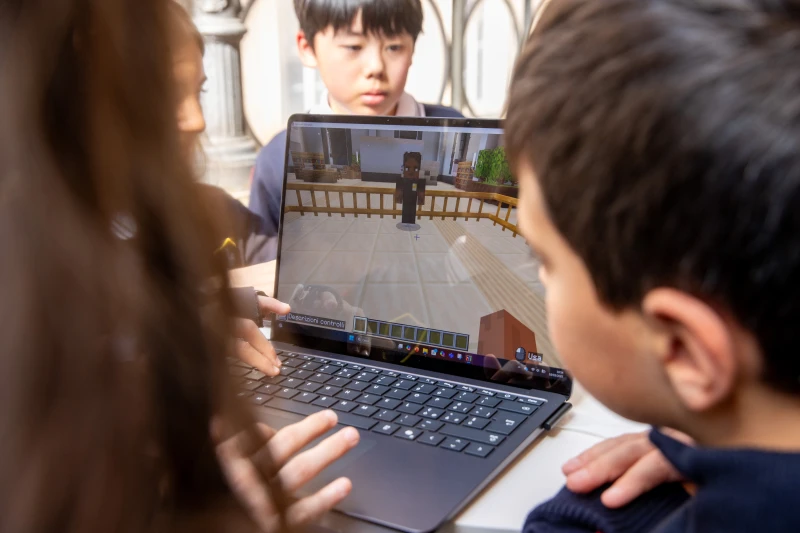 Students try out the new Minecraft Education experience “Peter Is Here: AI for Cultural Heritage” during a press conference unveiling the project on March 18, 2025, at the Vatican. / Credit: Daniel Ibañez/CNA