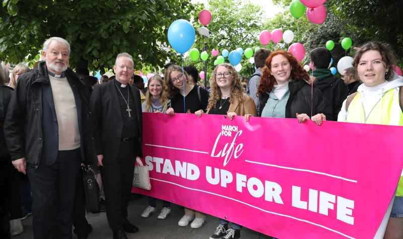 Bishop Kevin Doran of Elphin, chairman of the Irish bishops’ Council for Life (far left), and Archbishop Eamon Martin of Armagh, primate of all Ireland (second from left), stand with young pro-life activists at the 2024 Ireland March for Life in Dublin on May 6, 2024. / Credit: Courtesy of Pro Life Campaign