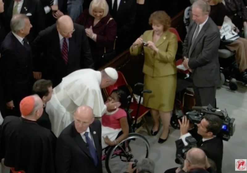 Stephanie Gabaud receives a blessing from Pope Francis at St. Patrick’s Cathedral in New York City on Sept. 24, 2015. / Credit: EWTN/screenshot