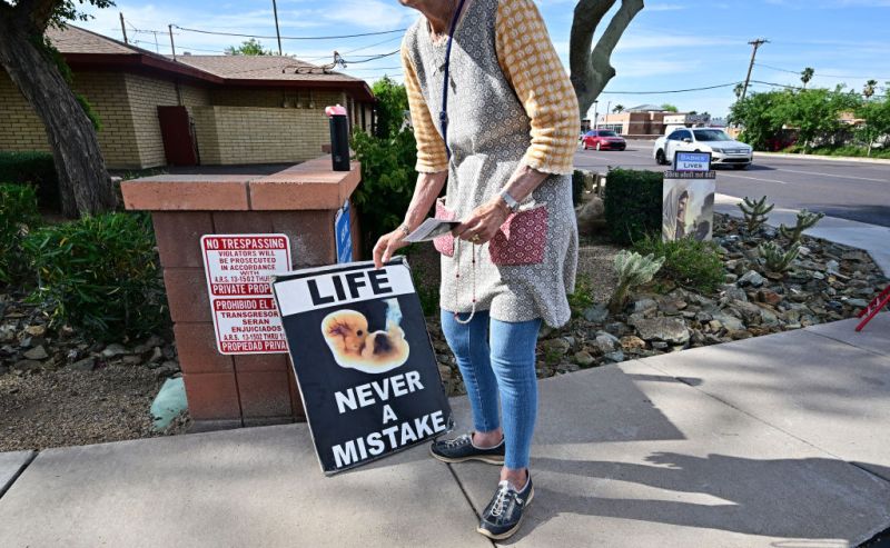 Longtime pro-life advocate Lynn Dyer places a sign that reads “Life Never a Mistake” on public property in front of Camelback Family Planning, an abortion clinic in Phoenix, on April 18, 2024. / Credit: FREDERIC J. BROWN/AFP via Getty Images