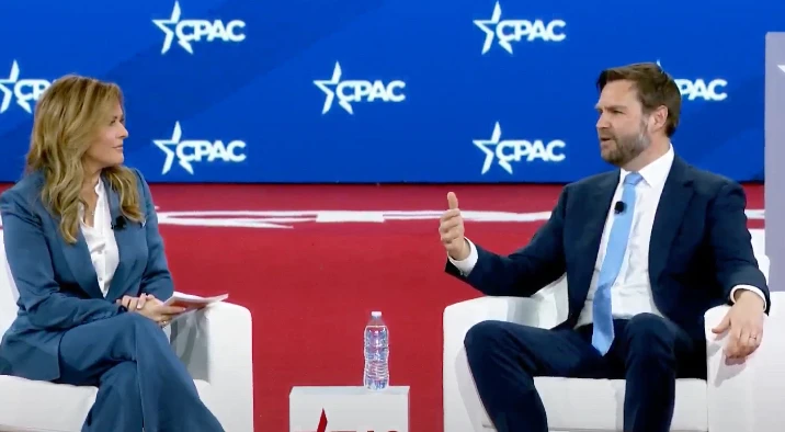 U.S. Vice President JD Vance speaks with Mercedes Schlapp at the 2025 Conservative Action Political Conference on Feb. 20, 2025, in National Harbor, Maryland. / Credit: Courtesy of Conservative Action Political Conference/YouTube screenshot