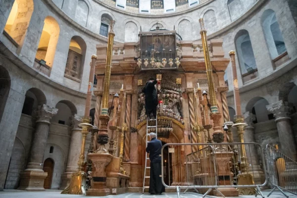 A Greek Orthodox monk pours oil into the lamps in front of the edicule of the Holy Sepulcher, which contains the venerated tomb. The three communities responsible for the Holy Sepulcher are the Greek Orthodox, the Latin Catholic, and the Armenian. Every movement and schedule inside the basilica is governed by the Status Quo. /…