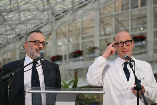 Dr. Sergio Alfieri (right) and Dr. Luigi Carbone give a press conference at Gemelli Hospital in Rome, where Pope Francis is hospitalized for tests and treatment for bronchitis, on Feb. 21, 2025. Alfieri said the pope asked him to say hat he has “the mind of a a 50-year-old man.” / Credit: ALBERTO PIZZOLI/AFP via…