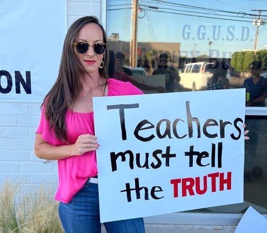 Jessica Tapia displays a sign outside the Garden Grove Unified School District board meeting on behalf of the Teachers Don’t Lie program. / Credit: Photo courtesy of Advocates for Faith and Freedom and Jessica Tapia