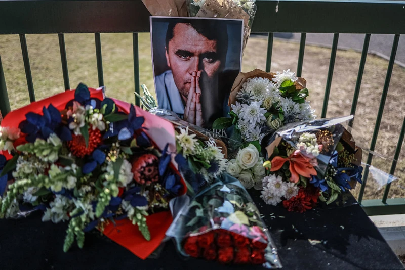 A general view of a wreath laid by mourners outside the U.S. Embassy in Pretoria on Sept. 11, 2025, following the fatal shooting of U.S. youth activist and influencer Charlie Kirk while speaking during an event at Utah Valley University in Orem, Utah. / Credit: PHILL MAGAKOE/AFP via Getty Images