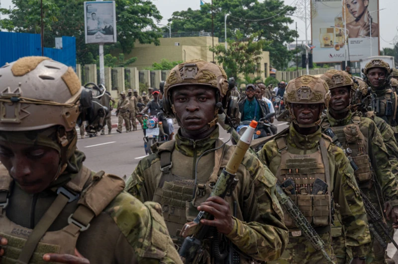 Democratic Republic of Congo Republican Guard soldiers walk in the streets of Kinshasa on March 1, 2025. As the M23 fighters continue their offensive in eastern DR Congo, hundreds of soldiers from the Republican Guard walk the streets of Kinshasa in a show of force. / Credit: HARDY BOPE/AFP via Getty Images