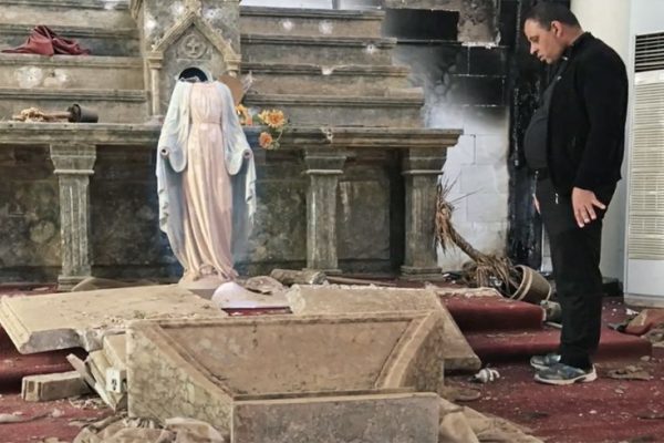 A priest surveys the damage caused by ISIS at a Catholic Church in Karamles, Iraq. / Credit: Photo courtesy of Stephen Rasche CNA Staff, Oct 23, 2023 / 08:45 am (CNA). Pope Francis cited the examples of Western intervention in Libya and Iraq in arguing that the West should not “export” its own “type of…