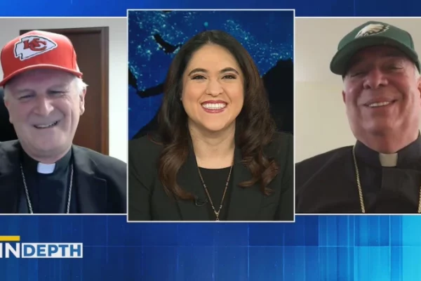 Kansas City Bishop James Johnston (left) and Philadelphia Archbishop Nelson Pérez (right) talk some clerical smack on “EWTN News in Depth” over their purportedly friendly Super Bowl wager. / Credit: “EWTN News in Depth”/Screenshot CNA Newsroom, Feb 7, 2025 / 21:05 pm (CNA). On Super Bowl Sunday, players for the Kansas City Chiefs and Philadelphia…