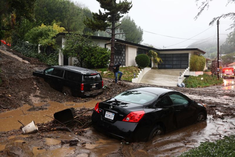 A person attempts to clear away debris from a mudslide as a powerful long-duration atmospheric river storm, the second in less than a week, continues to impact Southern California on Feb. 5, 2024, in Beverly Hills, California. / Credit: Mario Tama/Getty Images
