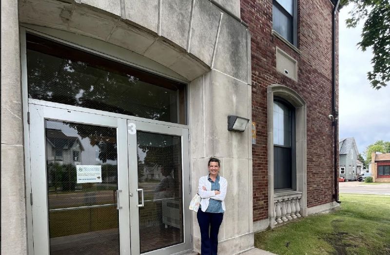 Cheryl Sporie, chair of the board of trustees at St. Thomas Aquinas Academy in Marinette, Wisconsin, stands in front of the vacant Garfield Elementary school building in the Marinette School District. Sporie filed a claim against the district on June 25, 2024, urging the district to sell the property after it refused to sell it to the Catholic school. / Credit: Photo courtesy of Wisconsin Institute for Law & Liberty