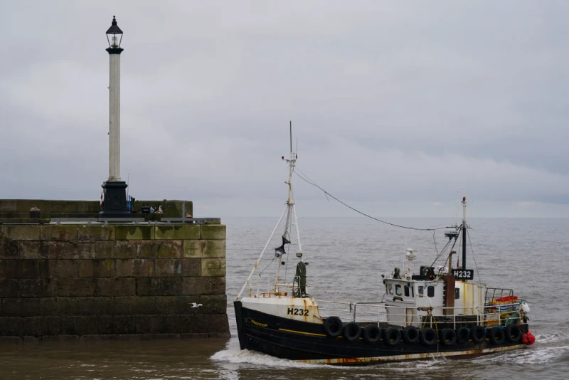 A fishing boat returns to Bridlington Harbor after a day at sea on Jan. 31, 2025, in Bridlington, England. Bridlington is the leading shellfish port in Europe. / Credit: Ian Forsyth/Getty Images