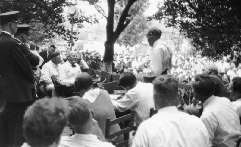 William Jennings Bryan (seated at left) being interrogated by Clarence Seward Darrow, during the trial of the State of Tennessee v. John Thomas Scopes, July 20, 1925. Because of the extreme heat, the proceedings were moved outdoors. / Credit: Smithsonian Institution from United States, No restrictions, via Wikimedia Commons