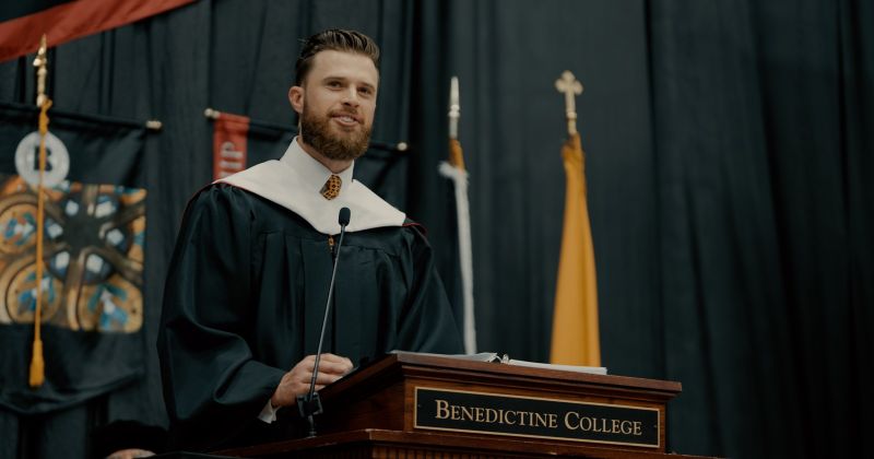 Kansas City Chiefs’ placekicker Harrison Butker speaks to college graduates in his commencement address at Benedictine College on Saturday, May 11, 2024. / Credit: Benedictine College