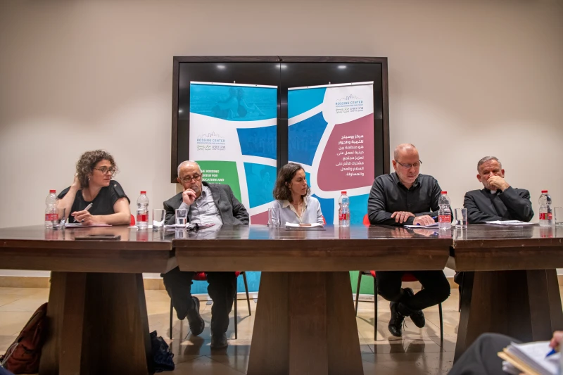 Speakers present at the briefing presenting the report “Attacks on Christians in Israel and East Jerusalem” by the Rossing Center on March 27, 2025. From left to right: Hana Bendcowsky, director of the Jerusalem Center for Jewish-Christian Relations at the Rossing Center; Bernard Sabella, a retired professor of sociology; Federica Sasso (Rossing Center)), moderator, Hussam Elias, executive director of the project; and Jesuit Father David Neuhaus. / Credit: Marinella Bandini