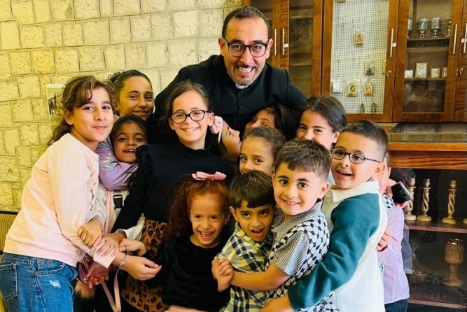 Father Bashar Fawadleh, Latin rite pastor of Taybeh, with children from his community. / Credit: Courtesy of Father Bashar Fawadleh.