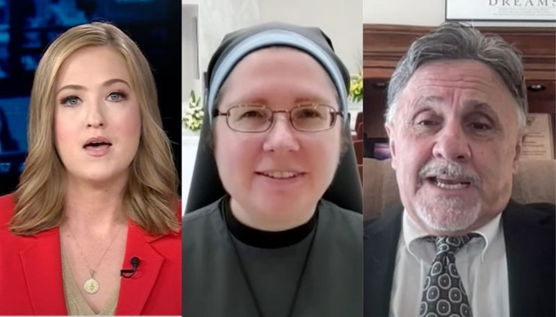 Reporter Catherine Hadro speaks with Sister Mary Gianna of the Disciples of the Lord Jesus Christ and Frank DeAngelis on “EWTN News In Depth” on April 19, 2024. Sister Mary Gianna, also known as Jenica Thornby, was a sophomore at Columbine High School and DeAngelis was principal on April 20, 1999, when two gunmen killed 12 students and one teacher before turning their guns on themselves. / Credit: “EWTN News In Depth” screen shots