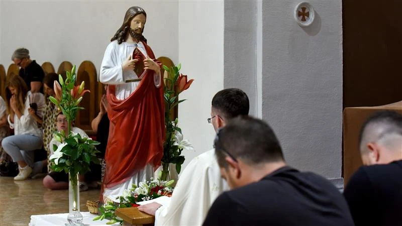 Faithful pray before a statue of the Sacred Heart of Jesus during Croatia’s consecration ceremony on June 27, 2025, as the nation dedicated itself anew to Christ’s divine love following the tradition established by their ancestors at the Church of Our Miraculous Lady of Sinj. / Credit: Petar Malbaša/Laudato TV