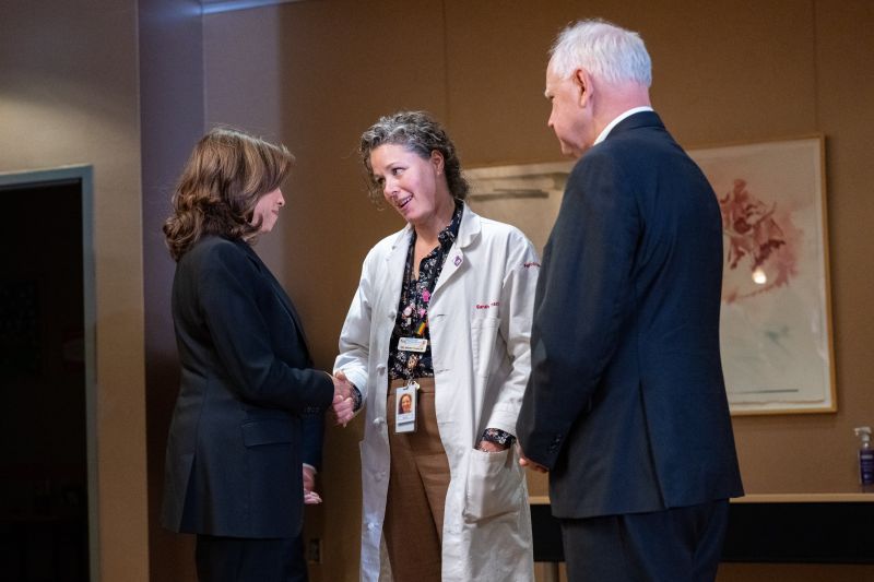 Vice President Kamala Harris arrives at Planned Parenthood in St. Paul, Minnesota, Thursday, March 14, 2024, and greets Dr. Sarah Taxler, chief medical officer of Planned Parenthood North Central States. Standing with the vice president is Minnesota Gov. Tim Walz. / Credit: The White House, Public domain, via Wikimedia Commons