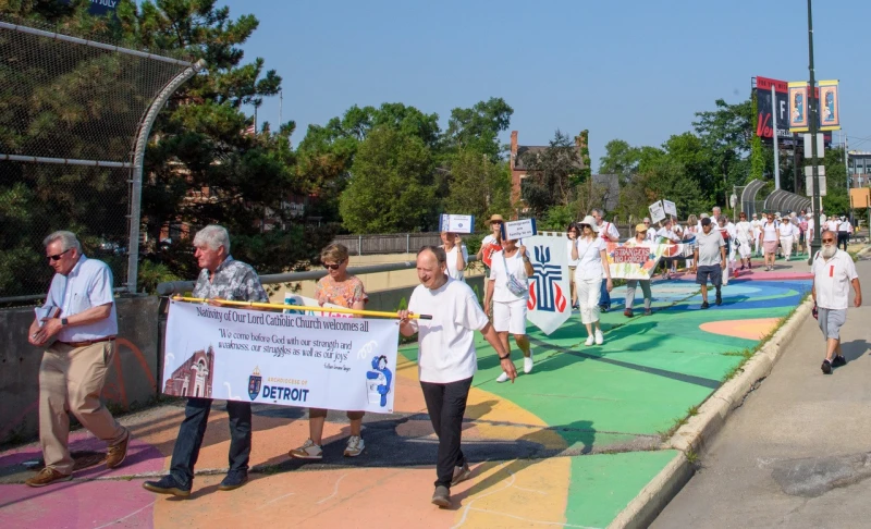 Members of the Catholic nonprofit Strangers No Longer and others march to the Detroit ICE headquarters in July 2025. / Credit: Tom Tomala, Strangers No Longer
