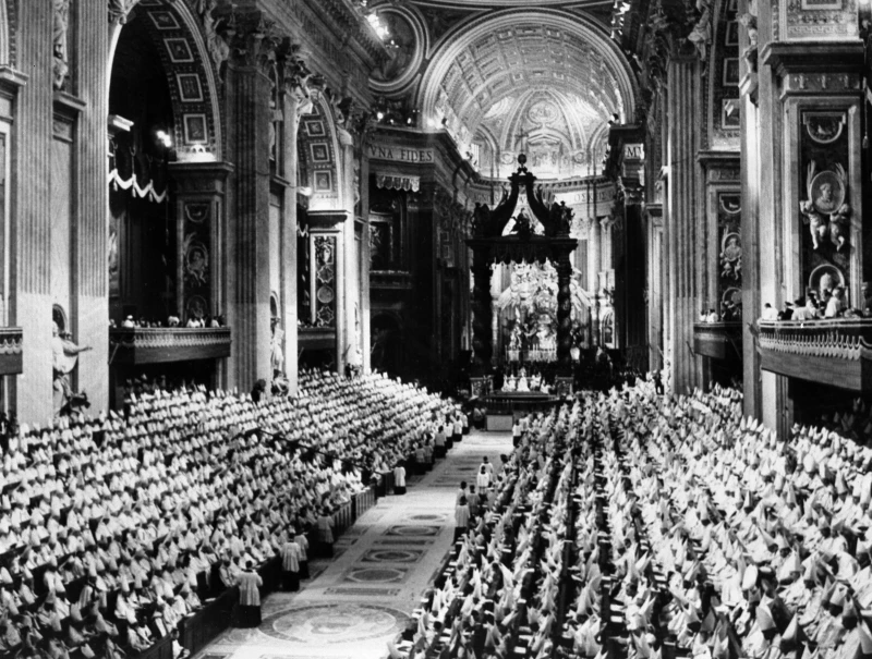 General view of the Council Fathers in St. Peter’s Basilica on Dec. 8, 1962, at the Vatican, at the end of the first session of the Second Ecumenical Council of the Vatican, or Vatican II. / Credit: AFP via Getty Images