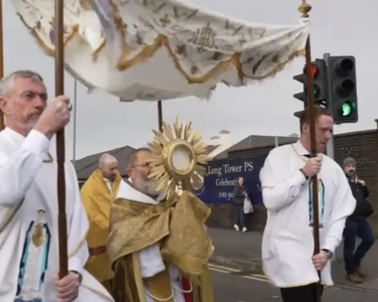 The procession halted for adoration in Guildhall Square, a moving and powerful setting that was the scene of many past Catholic civil rights protests.