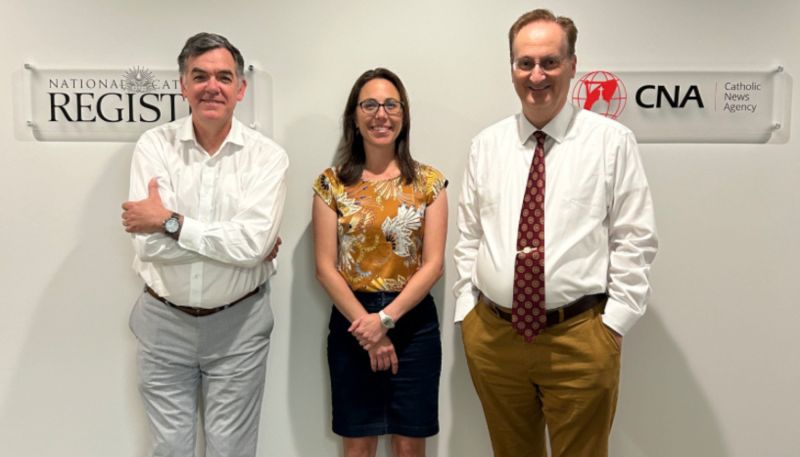 National Catholic Register Editor-in-Chief Shannon Mullen (left) and Catholic News Agency Editor-in-Chief Ken Oliver (right) flank Jeanette DeMelo (center), the executive director of the two EWTN News properties. / Rita Sporleder/EWTN News