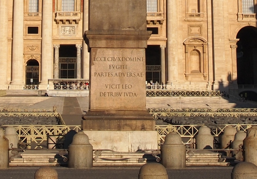 An interesting and often overlooked inscription is found on the base of the obelisk in St. Peter’s square. As shown above, it says: “Ecce Crux Domini, fugite partes adversae.” Thus there is a kind of perpetual “exorcism” as people enter the Holy See.