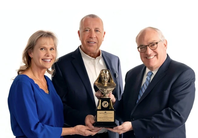 Michael P. Warsaw, chairman and CEO of EWTN Global Catholic Network, presents the 2024 Mother Angelica Award to Curtis and Michaelann Martin, co-founders of the Fellowship of Catholic University Students, on Dec. 12, 2024. / EWTN