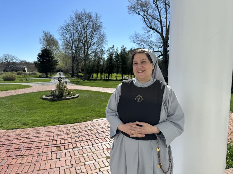 Mother Marla Marie stands on the front porch of the sisters’ Mother of the Light convent in Dartmouth, Massachusetts. / Credit: Joe Bukuras/CNA