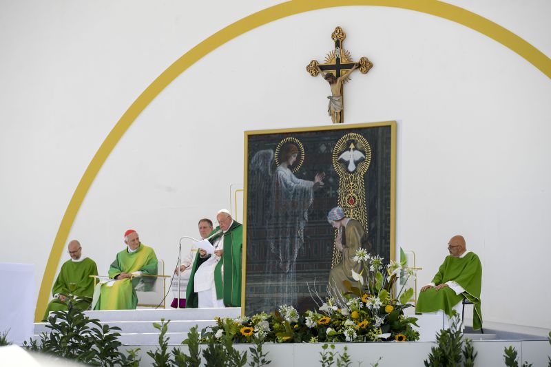 An image of the annunciation and the incarnation — when God became man in the womb of the Virgin Mary — was placed close to the altar during a Mass Pope Francis celebrated on July 7, 2024, in Trieste, Italy. The pope was in Trieste to attend the last morning of a July 3-7 Catholic conference on the topic of democracy. / Vatican Media