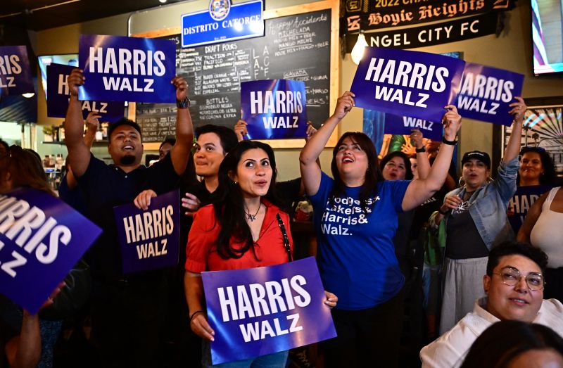 Supporters of the Latinos for Harris-Walz campaign attend a party to watch presidential candidate Vice President Kamala Harris deliver her acceptance speech in Los Angeles on Aug. 22, 2024, the fourth and last day of the Democratic National Convention. / Credit: Photo by FREDERIC J. BROWN/AFP via Getty Images