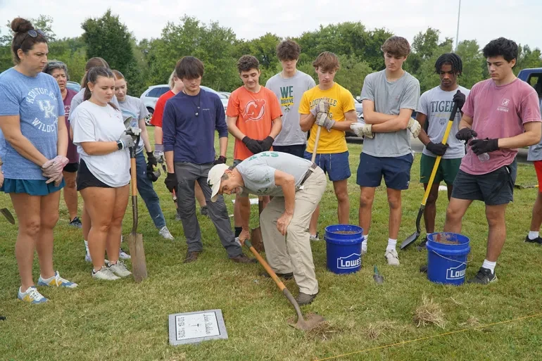 Students use shovels to locate a temporary marker at a gravesite in Meadow View Cemetery in Louisville, Kentucky, Sept. 21, 2024. Credit: The Record/Ruby Thomas