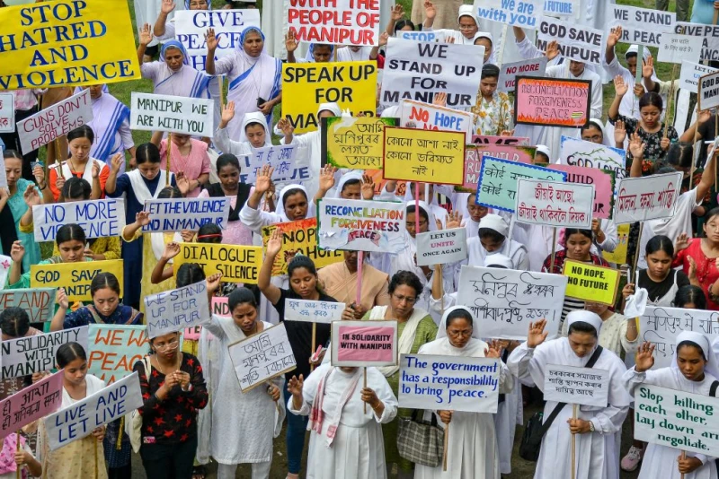 Members representing Assam Christian Forum and CRI-NEI in India take part in a solidarity prayer meeting for restoration of peace in Manipur after ethnic violence at a school in Guwahati on June 24, 2023. / Credit: BIJU BORO/AFP via Getty Images