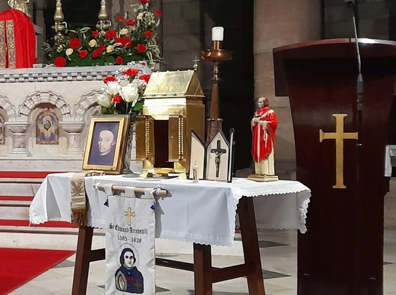 An altar display of items associated with 17th-century English martyr St. Edmund Arrowsmith at the Church of St. Edmund and St. Oswald in Ashton-in-Makerfield, a former mining town midway between Liverpool and Manchester / Photo credit: Joseph Kellaway Burnell