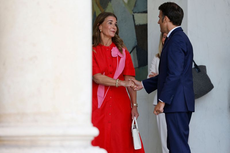 Melinda French Gates shakes hands with French President Emmanuel Macron after a meeting at the Elysee Palace on June 23, 2023. / Credit: LUDOVIC MARIN/AFP via Getty Images