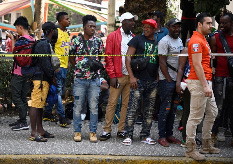 Migrants, mostly Haitians, wait in Mexico City to be sent to different migration centers in Puebla, Hidalgo, and Queretaro to obtain their humanitarian visas, which will allow them to continue their journey to the U.S. border ion March 31, 2023. / Credit: ALFREDO ESTRELLA/AFP via Getty Images