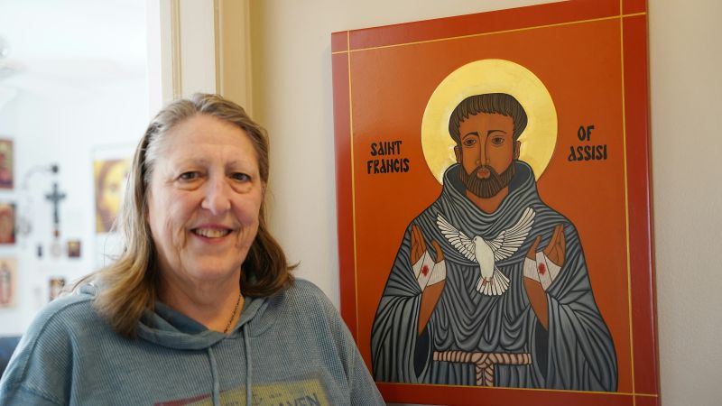 Kathleen Bordo Crombie stands next to an icon of St. Francis of Assisi, dedicated to her late husband, Robyn. The Church of the Divine Child in Dearborn, Michigan, parishioner took up iconography after taking a class at the Sacred Art Institute of St. Edmund’s Retreat Center on Enders Island in Mystic, Connecticut, where she learned iconography is rooted in depicting the image of God. / Credit: Daniel Meloy/Detroit Catholic
