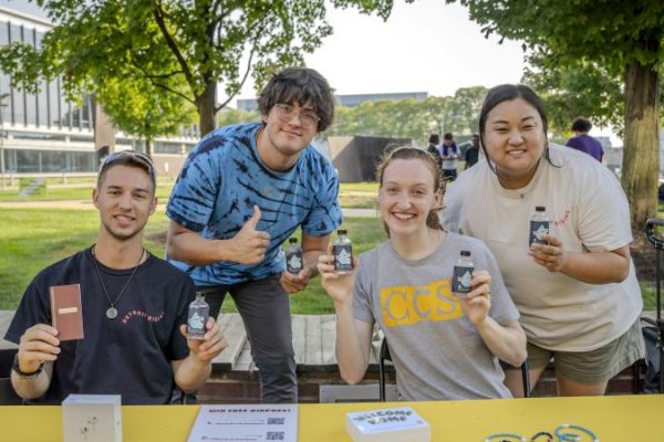 Left to right, Victor Fenik, J.P. Ledermann, Jocelyn Reiter, and Anna Picasso distribute bottles of holy water to new and returning students during the involvement fair on Aug. 26, 2024, at the College for Creative Studies in Detroit. Members of Detroit Catholic Campus Ministry have been distributing holy water at the start of the academic…