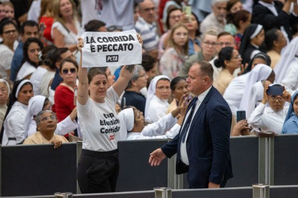 An activist from PETA (People for the Ethical Treatment of Animals) holds a sign that reads “la corrida e peccato” (“bullfighting is a sin”), temporarily interrupted Pope Francis’ catechesis during his Wednesday general audience on Aug. 7, 2024. / Credit: Daniel Ibañez/CNA Vatican City, Aug 7, 2024 / 14:38 pm (CNA). Two animal rights activists…