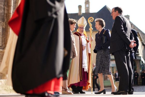 Bishop Jacques Habert of the Diocese of Bayeux and Lisieux in France greets Britain’s Princess Anne (right) on June 5, 2024, as she arrives to attend the Commonwealth War Graves Commission’s annual service of remembrance at Bayeux Cathedral in Bayeux, Normandy, northwestern France, as part of the events to mark the 80th anniversary commemorations of…