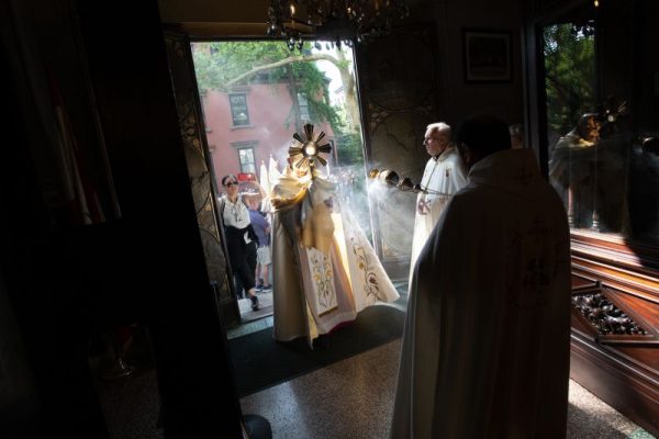 Bishop Robert J. Brennan of Brooklyn holds the Eucharist as he enters Our Lady of Lebanon Maronite Cathedral in Brooklyn, New York, on May 26, 2024. The visit was part of the New York leg of the National Eucharistic Pilgrimage. / Credit: Jeffrey Bruno/CNA New York City, N.Y., May 27, 2024 / 17:11 pm (CNA)….