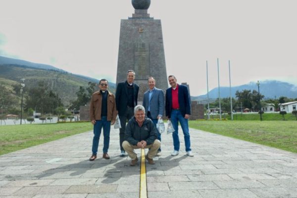 The President of the Communications Commission of the 2024 International Eucharistic Congress, Father Livingston Olivares (left), accompanies EWTN Vice President for Programming and Production Peter Gagnon (center-right), EWTN Vice President for Spanish-language Production, Marketing, and Radio Enrique Duprat (center-left), EWTN Production Director Michael Holmes (far right), and IEC Quito 2024 Communications Coordinator Marcelo Mejía (front,…