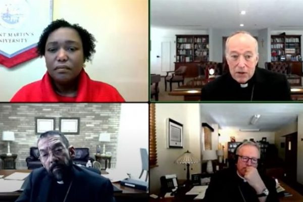 Gloria Purvis, Cardinal Robert McElroy, Bishop Daniel Flores, and Bishop Robert Barron discuss polarization in the Catholic Church during a panel discussion hosted by the United States Conference of Catholic Bishops, Catholic Charities USA, Glenmary Home Missioners, and the Jesuit Conference on May 14, 2024. / Credit: The United States Conference of Catholic Bishops’ Live…