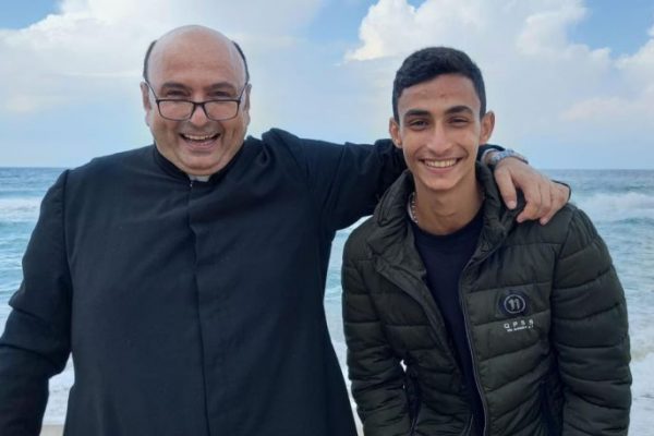 Suhail Shadi Abu Dawod with Father Gabriel Romanelli, the parish priest of Gaza, on the seashore in Gaza last summer 2023. Romanelli, belongs to the Institute of the Incarnate Word (IVE), a Catholic clerical religious institute founded in Argentina on March 25, 1984, which Abu Dawod has petitioned to join. / Credit: Courtesy of Father…