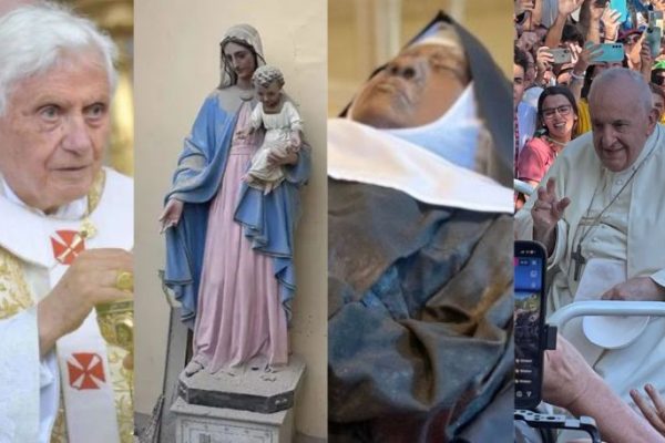 The funeral for Pope Benedict XVI, a statue that survived an earthquake, the remarkably well preserved body of Sister Wilhelmina Lancaster, and Pope Francis at World Youth Day in Lisbon, Portugal, were among the top Catholic stories of 2023. / Credit: Paul Badde/EWTN; Facebook Antuan Ilgit SJ; Kelsey Wicks/CNA; Pablo Pilco/EWTN News CNA Staff, Dec…