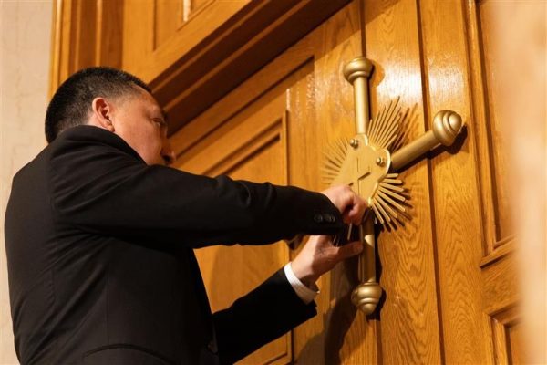 A member of the maintenance crew at the Basilica of the National Shrine of the Immaculate Conception in Washington, D.C., places a seal on the Holy Door at the basilica after Archbishop Timothy Broglio blessed the seal and doors on Dec. 3, 2023. / Credit: The Basilica of the National Shrine of the Immaculate Conception…