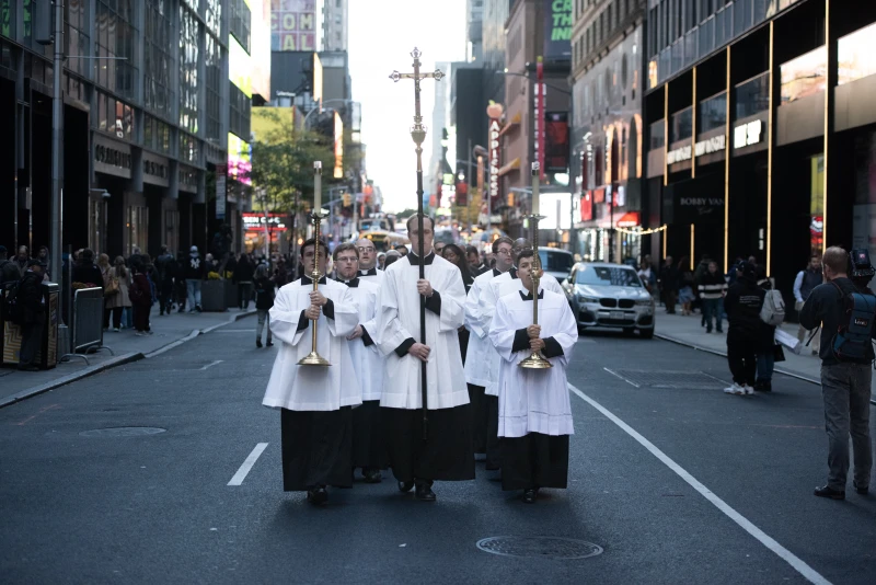 Afterward the congregation filed out into Midtown Manhattan for a procession that took Jesus in the Eucharist past Radio City Music Hall and into Times Square and surrounding areas.